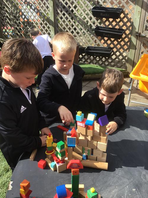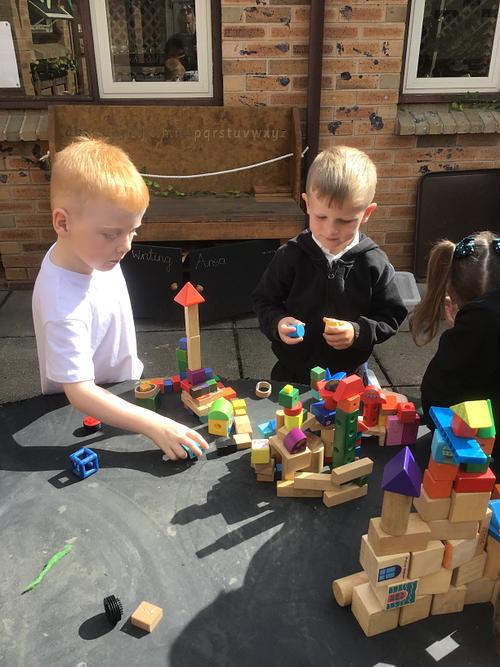 Learning through play in the areas creating towers with bricks outside and making things in the creative area.
