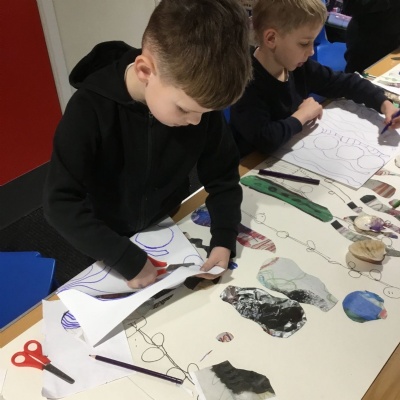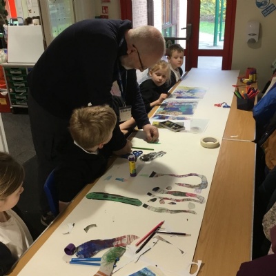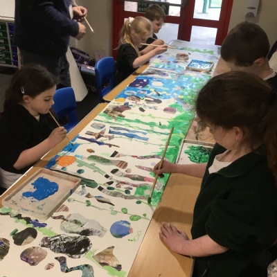 Class 2 recently enjoyed a fantastic visit from our artist in residence, Kane Cunningham, who spent time working with the children on a large-scale mixed media art project. The work was inspired by our current science learning about plants and links nicely with our upcoming geography topic on coasts.