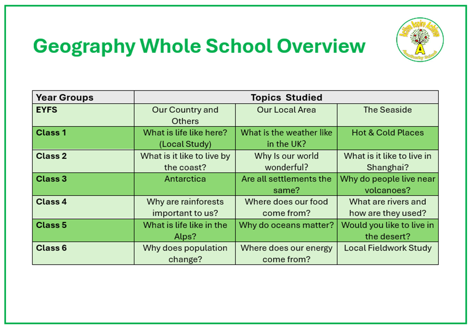 The scheme has been carefully adapted to reflect our local context, making full use of our local area and surrounding region to bring learning to life. Pupils regularly explore real places, use fieldwork skills, and make meaningful connections between local, national and global geography. This approach helps pupils to develop a strong sense of place, as well as an understanding of both human and physical geography.