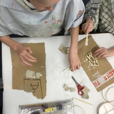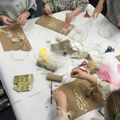 Kane began the day by demonstrating a range of mono printing methods, showing pupils how simple materials can produce striking and expressive results. Class 4 then explored these techniques first-hand, combining different materials and textures to develop richly layered mixed-media prints. Pupils particularly enjoyed the freedom to experiment, discovering how each print could be completely unique.